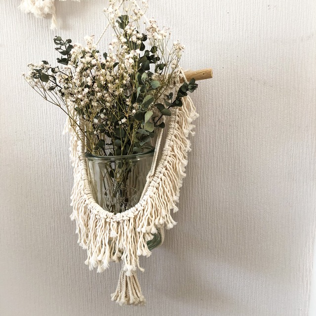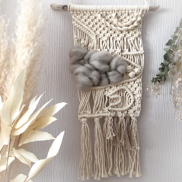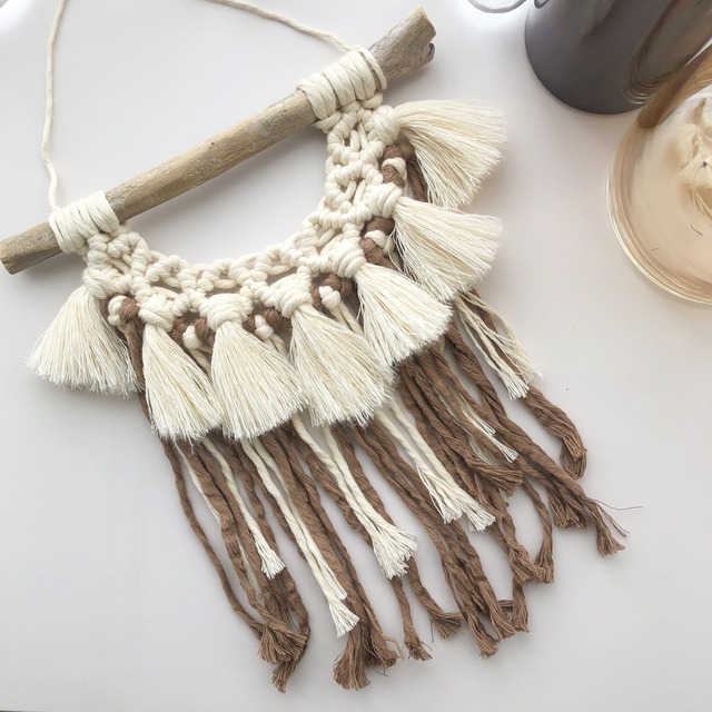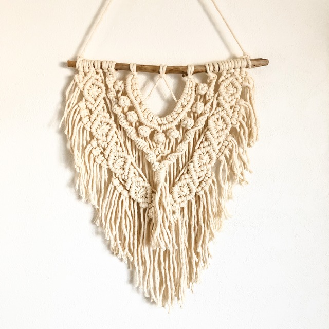 オリジナルのタペストリーです。 1本撚りの紐を使用しておりフリンジがふわふわで可愛いです☺︎ しゃこ結びのデザインが特徴的です♪ サイズ 流木 約30cm 長さ(流木からフリンジの裾) 約35cm